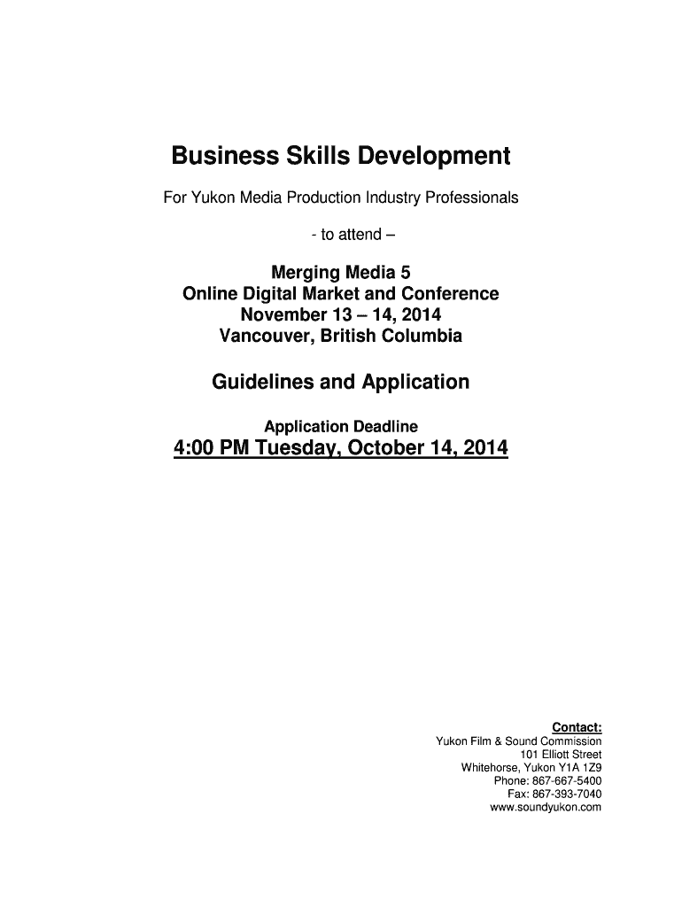 Business Skills Development For Yukon Media Production Industry Professionals to attend Merging Media 5 Online Digital Market and Conference November 13 14, 2014 Vancouver, British Columbia Guidelines