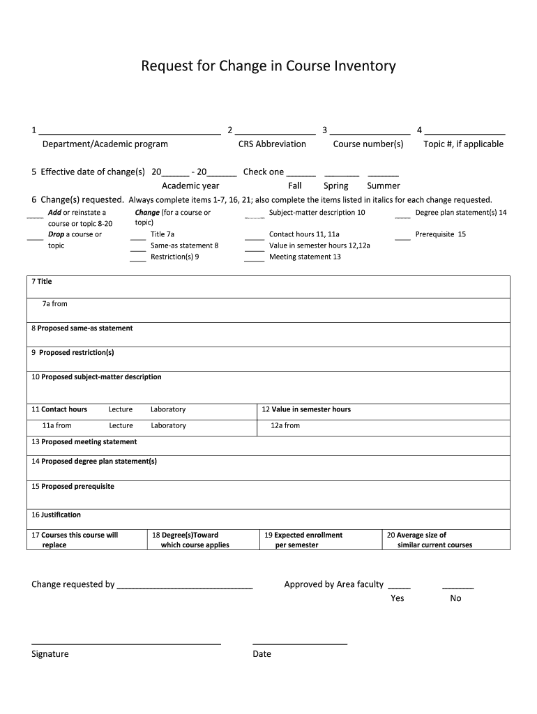 RequestforChangeinCourseInventory 1 2 3 4 Department×Academic program Abbreviation Course number’s) Topic#, inapplicable 20 Check one 5Effectivedateofchange×s)20 Academic year Fall Spring Summer