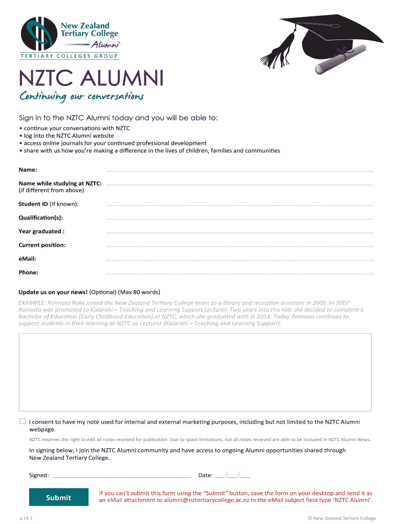 Information such as name, contact details, graduation year, program completed, and current job position may need to be reported on the NZTC Alumni form.