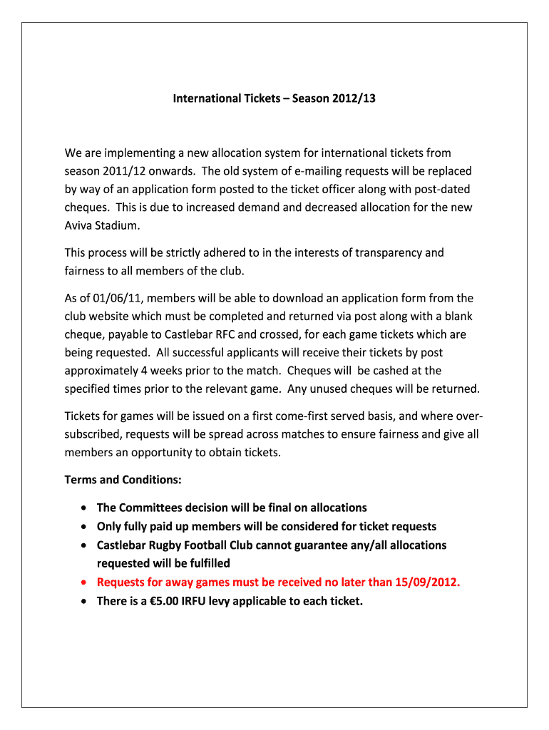 This document outlines the application process for international match tickets for the Castlebar Rugby Football Club, including terms and conditions.