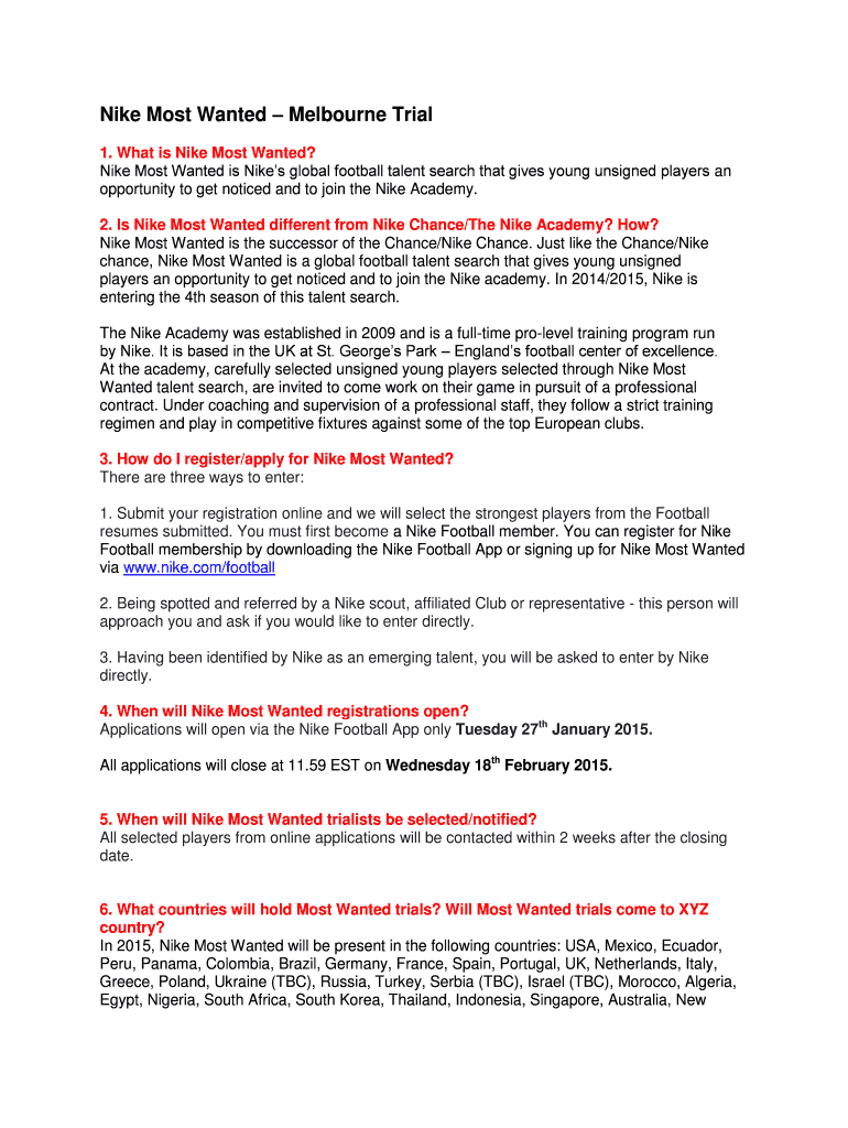 Nike Most Wanted Melbourne Trial 1. What is Nike Most Wanted? Nike Most Wanted is Nike's global football talent search that gives young unsigned players an opportunity to get noticed and to join the