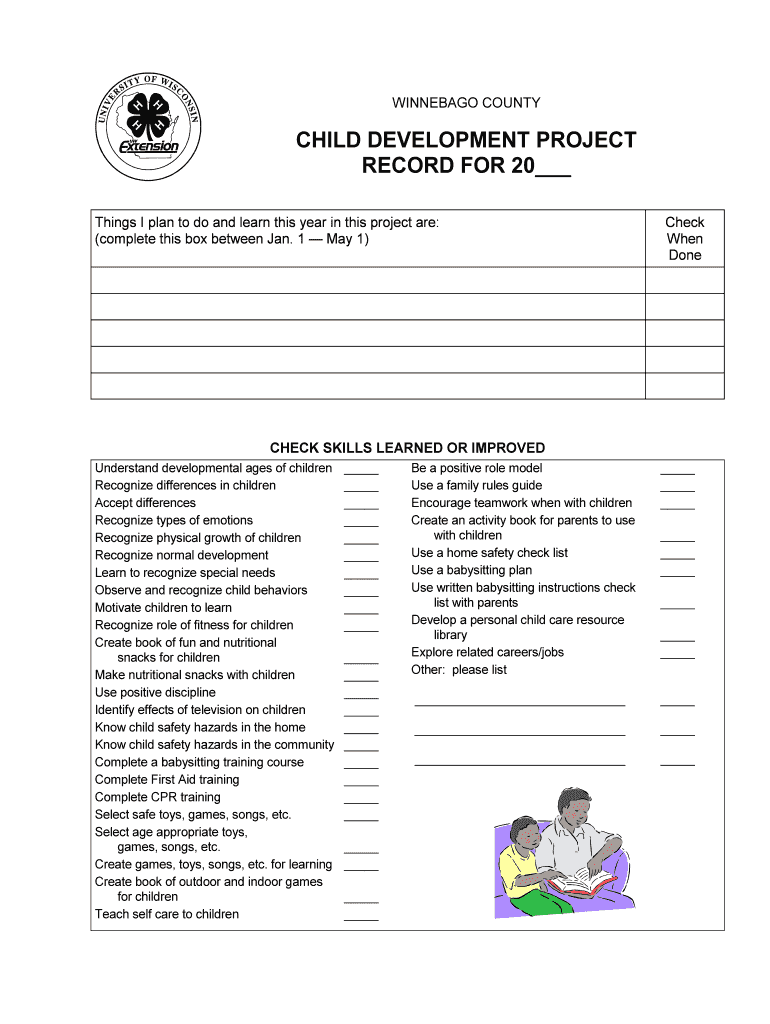 WINNEBAGO COUNTY CHILD DEVELOPMENT PROJECT RECORD FOR 20 Things I plan to do and learn this year in this project are: (complete this box between Jan. 1 May 1) Check When Done CHECK SKILLS LEARNED