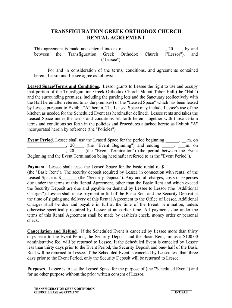 TRANSFIGURATION GREEK ORTHODOX CHURCH RENTAL AGREEMENT This agreement is made and entered into as of, 20, by and between the Transfiguration Greek Orthodox Church (“Lessor “), and (“Lessee “).