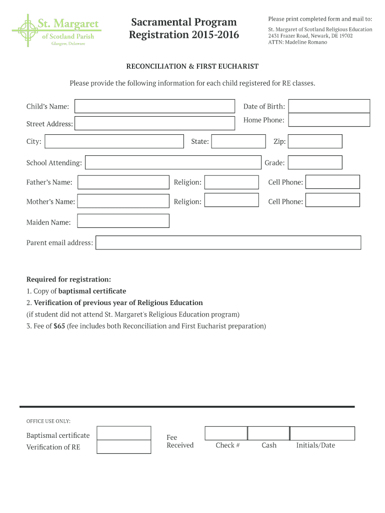 Sacramental Program Registration 20152016 Please print completed form and mail to: St. Margaret of Scotland Religious Education 2431 Fraser Road, Newark, DE 19702 ATTN: Madeline Romano RECONCILIATION