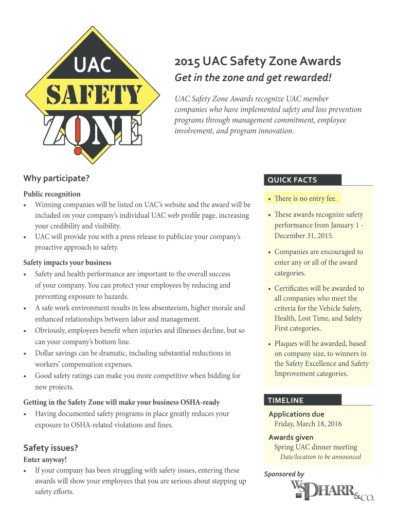 2015 UAC Safety Zone Awards Get in the zone and get rewarded! UAC Safety Zone Awards recognize UAC member companies who have implemented safety and loss prevention programs through management commitment,