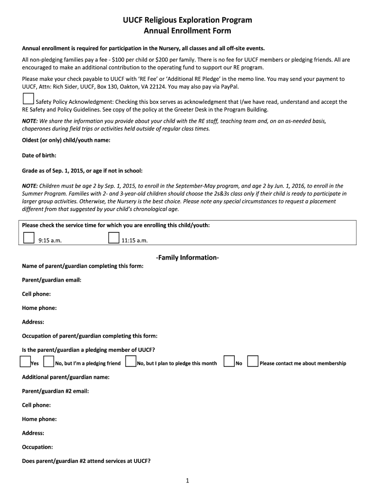 USCF Religious Exploration Program Annual Enrollment Form Annual enrollment is required for participation in the Nursery, all classes and all offsite events. All nonpledging families pay a fee $100