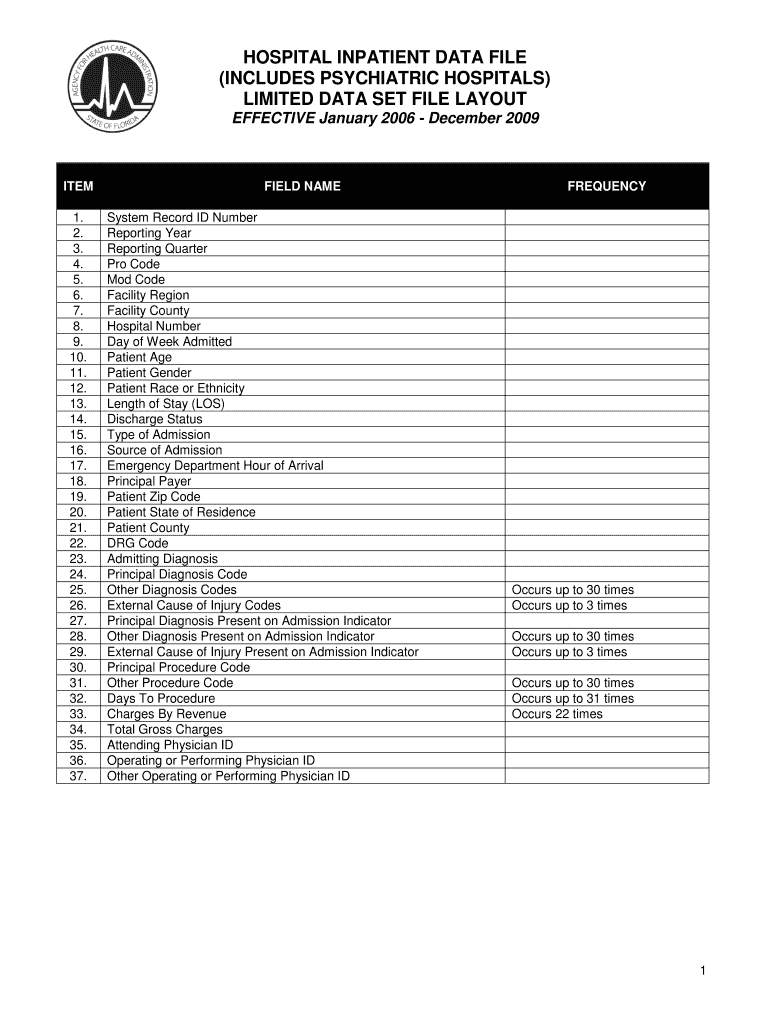 HOSPITAL INPATIENT DATA FILE (INCLUDES PSYCHIATRIC HOSPITALS) LIMITED DATA SET FILE LAYOUT EFFECTIVE January 2006 December 2009 ITEM 1. 2. 3. 4. 5. 6. 7. 8. 9. 10. 11. 12. 13. 14. 15. 16. 17. 18.