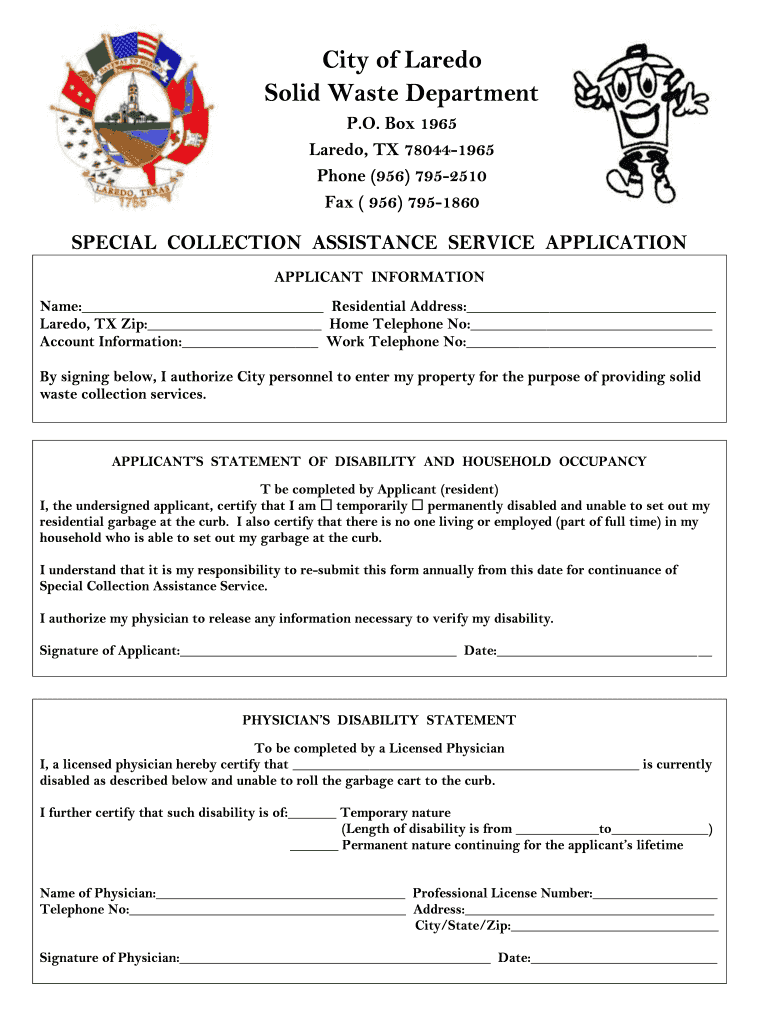 City of Laredo Solid Waste Department P.O. Box 1965 Laredo, TX 780441965 Phone (956× 7952510 Fax (956× 7951860 SPECIAL COLLECTION ASSISTANCE SERVICE APPLICATION APPLICANT INFORMATION Name: Residential