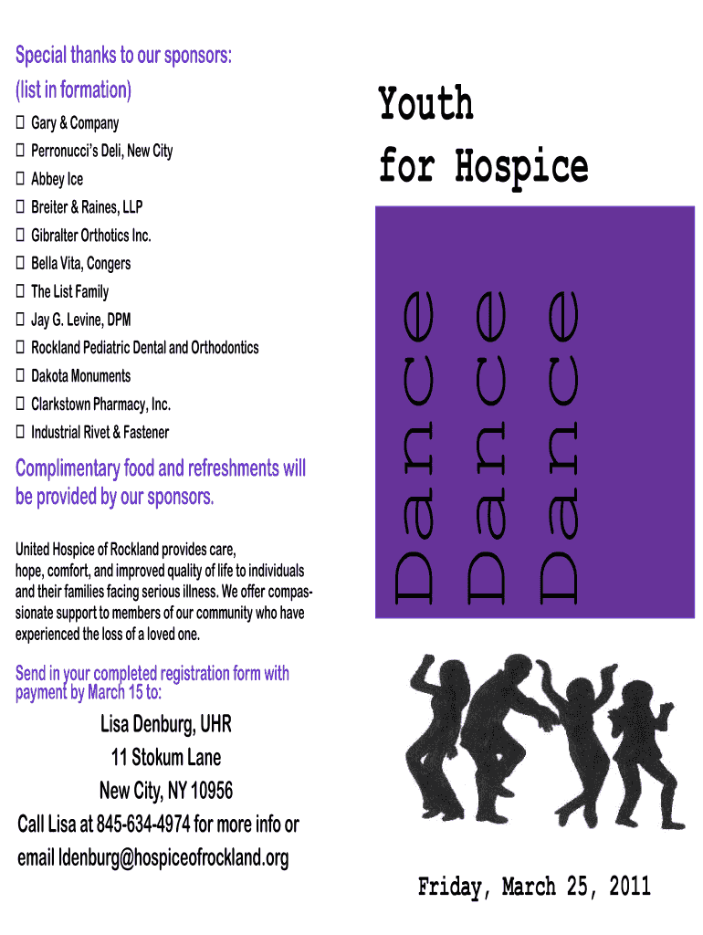 Special thanks to our sponsors: (list in formation) Gary & Company Perronucci s Deli, New City Abbey Ice Crater & Rains, LLP Youth for Hospice Gibraltar Orthotics Inc. The List Family Jay G. Levine,
