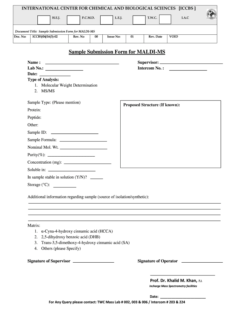 INTERNATIONAL CENTER FOR CHEMICAL AND BIOLOGICAL SCIENCES ICC BS H.E.J. P.C.M.D. L.E.J. T.W.C. I.A.C Document Title: Sample Submission Form for MALDIVES Doc. No: ICC BS×04×16×3)02 Rev. No 00 Issue