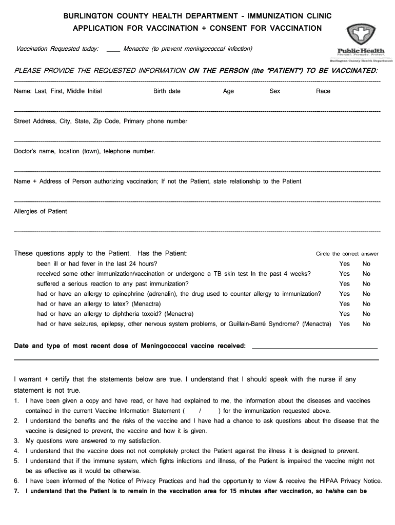 BURLINGTON COUNTY HEALTH DEPARTMENT IMMUNIZATION CLINIC APPLICATION FOR VACCINATION + CONSENT FOR VACCINATION Requested today: Enacted (to prevent meningococcal infection) PLEASE PROVIDE THE REQUESTED