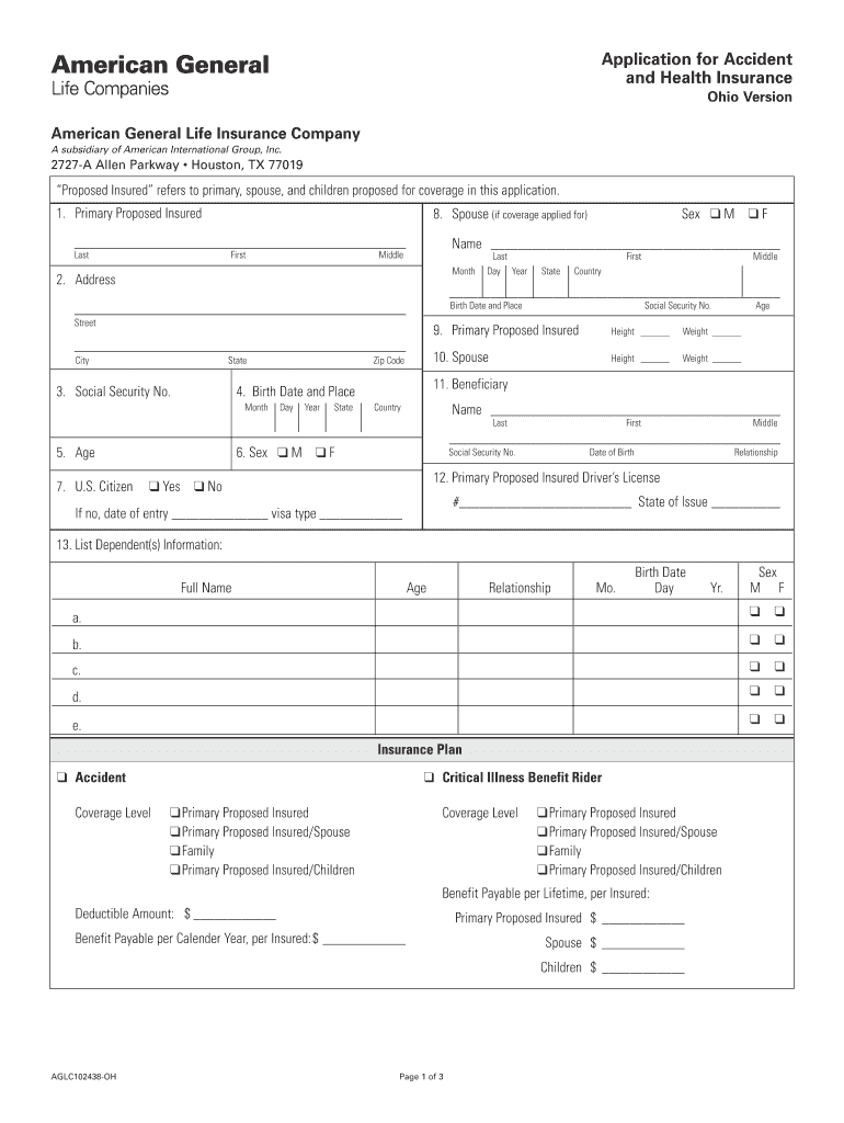 Eligibility to complete the form includes individuals residing in Ohio who are seeking accident and health insurance. The primary proposed insured must be at least 18 years old and must provide accurate health information.