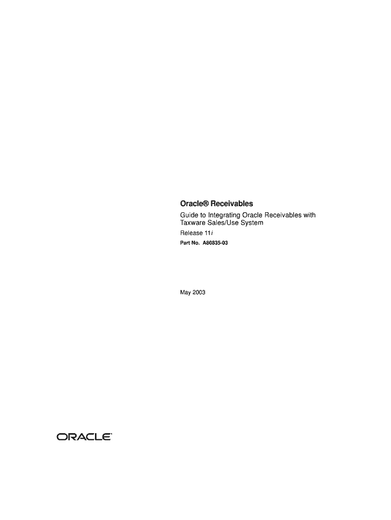 The Oracle® Receivables Guide to Integrating Oracle Receivables with Taxware Sales/Use System is a document that outlines the procedures and best practices for connecting Oracle Receivables software with Taxware's sales and use tax processing system. It provides technical details and instructions to facilitate accurate tax calculations and compliance.