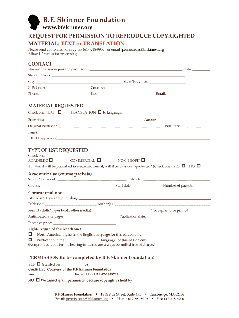 B.F. Skinner Foundation www.bfskinner.org REQUEST FOR PERMISSION TO REPRODUCE COPYRIGHTED MATERIAL: TEXT or TRANSLATION Please send completed form by fax (6172189906) or email (permissions Skinner.org)