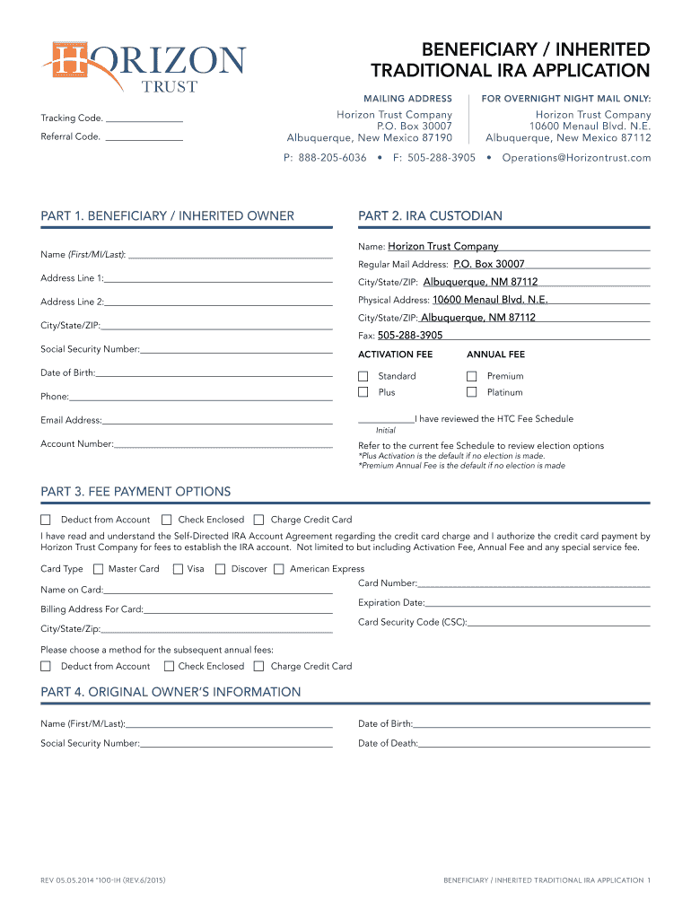 BENEFICIARY / INHERITED TRADITIONAL IRA APPLICATION MAILING ADDRESS Horizon Trust Company P.O. Box 30007 Albuquerque, New Mexico 87190 Tracking Code. Referral Code. FOR OVERNIGHT NIGHT MAIL ONLY: