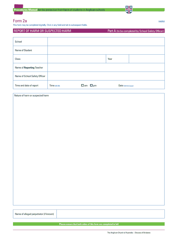 Procedures Manual for the protection from harm of students in Anglican schools Form 2a HARM This form may be completed digitally. Click in any field and tab to subsequent fields. Report of harm or