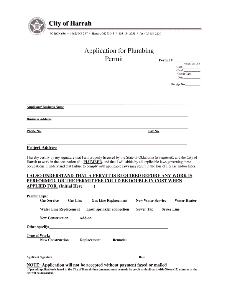 Get the free City of Harrah Application for Plumbing Permit