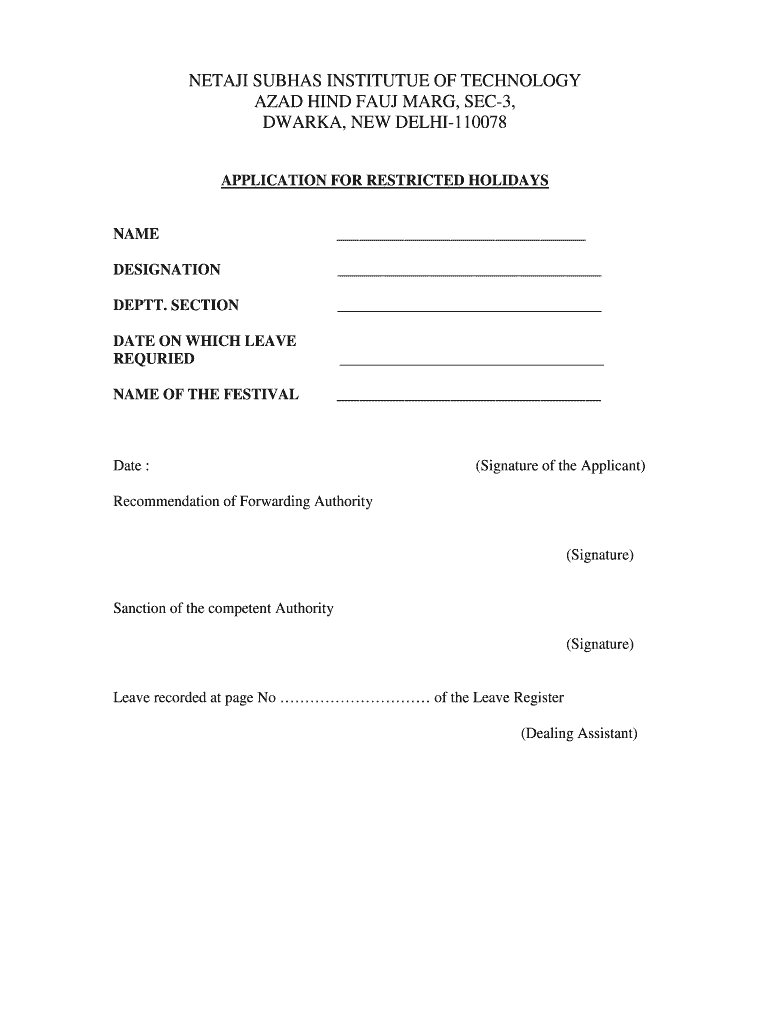 NET AJI SUBHASH INSTITUTE OF TECHNOLOGY AZAD HIND FAUX MARY, SEC3, DARK, NEW DELHI110078 APPLICATION FOR RESTRICTED HOLIDAYS NAME DESIGNATION DEPTH. SECTION DATE ON WHICH LEAVE REBURIED NAME OF THE