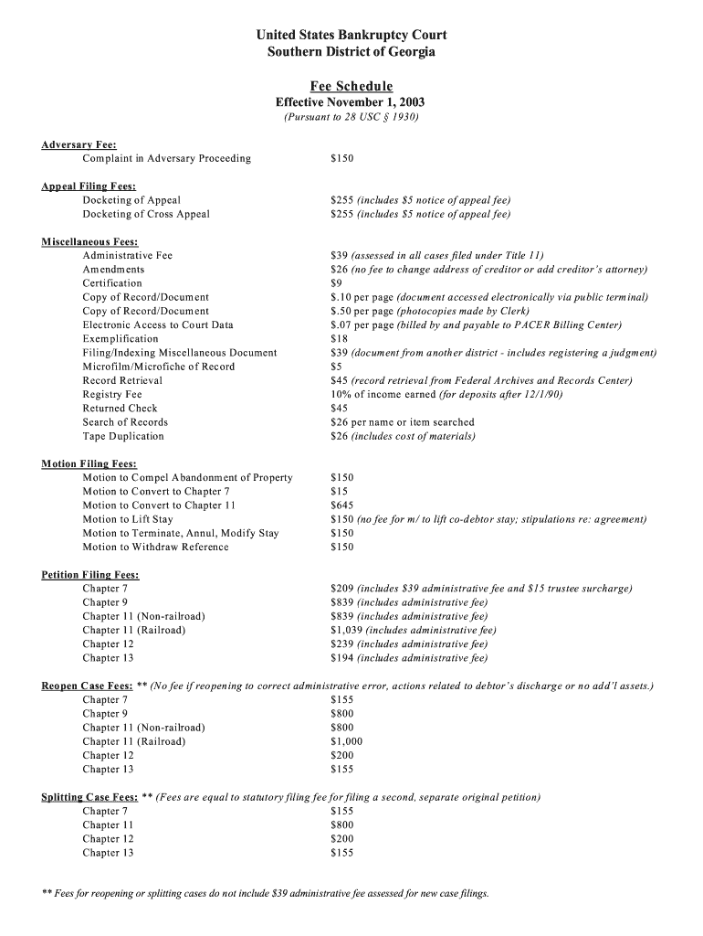 United States Bankruptcy Court Southern District of Georgia Fee Schedule Effective November 1, 2003 (Pursuant to 28 USC 1930) Adversary Fee: Com plaint in Adversary Proceeding $150 Appeal Filing Fees: