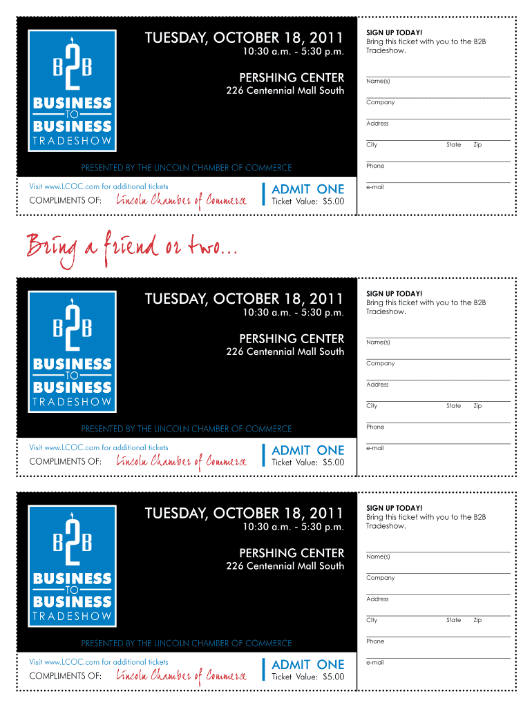 Tuesday, October 18, 2011 10:30 a.m. 5:30 p.m. Pershing Center 226 Centennial Mall South BUSINESS Name’s) Company TO BUSINESS Address TRADES City Presented by the Lincoln Chamber of Commerce Visit