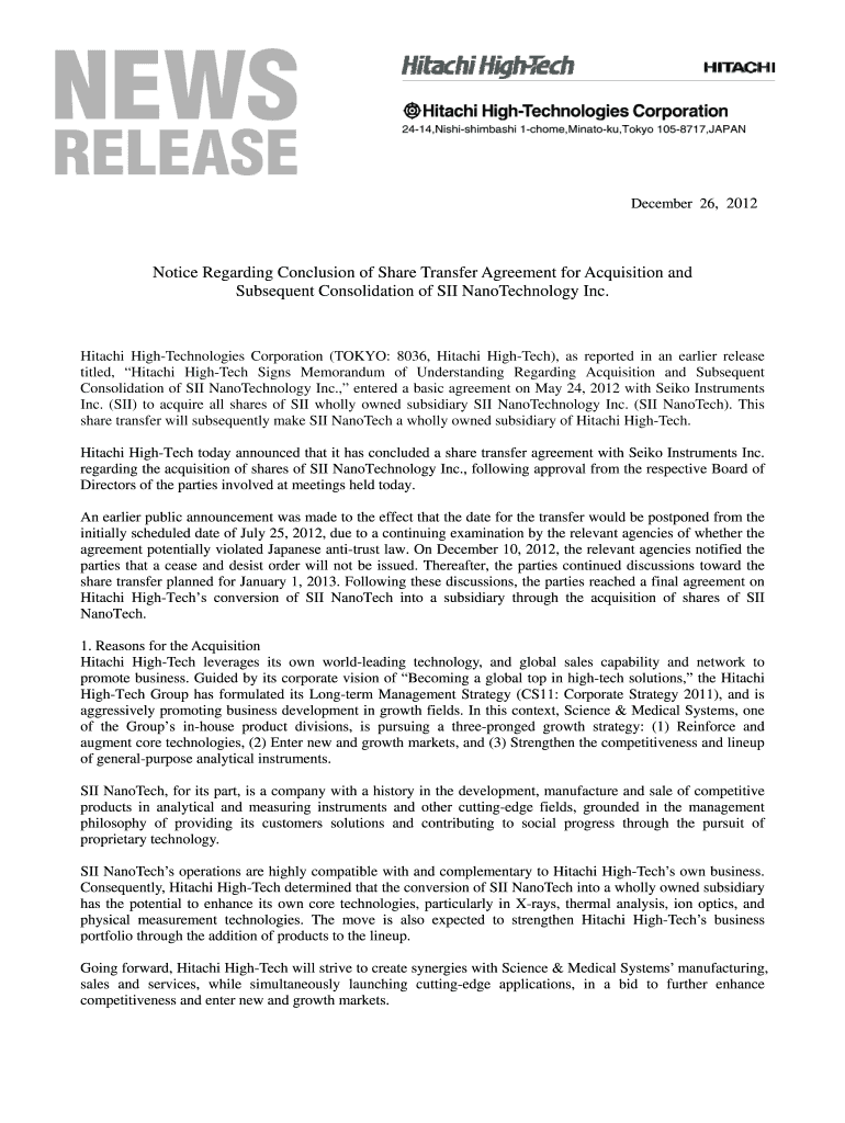 December 26, 2012Notice Regarding Conclusion of Share Transfer Agreement for Acquisition and