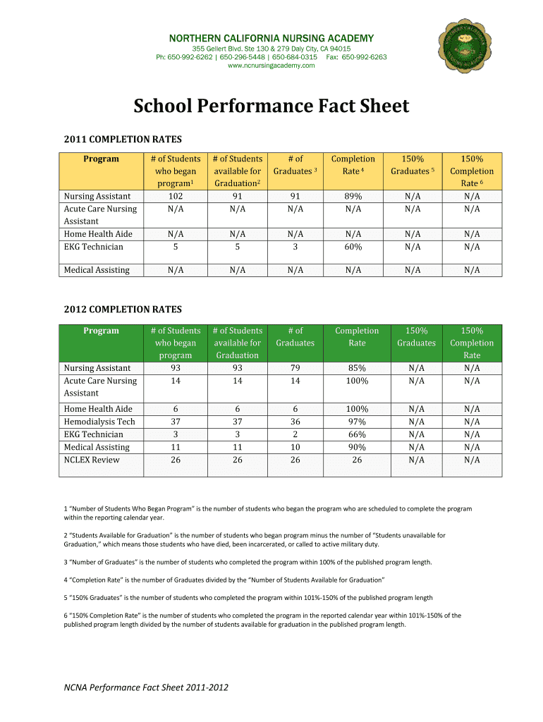 NORTHERN CALIFORNIA NURSING ACADEMY 355 Geller Blvd. Ste 130 & 279 Daly City, CA 94015 pH: 650-992-6262 650-296-5448 650-684-0315 Fax: 650-992-6263 www.ncnursingacademy.com School Performance Fact