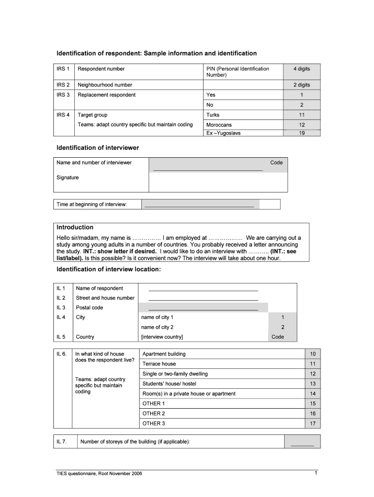 Identification of respondent: Sample information and identification IRS 1 Respondent number IRS 2 Neighborhood number IRS 3 PIN (Personal Identification Number) Replacement respondent 4 digits 2 digits