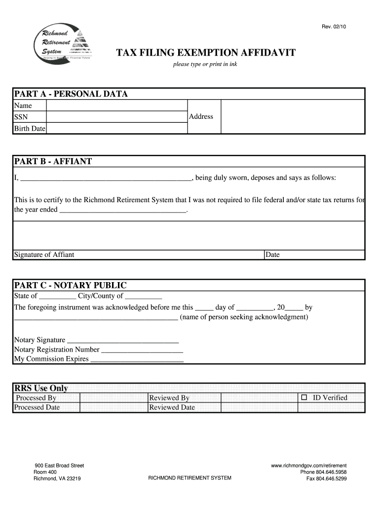 This affidavit certifies that the affiant was not required to file federal and/or state tax returns for a specified year, intended for submission to the Richmond Retirement System.