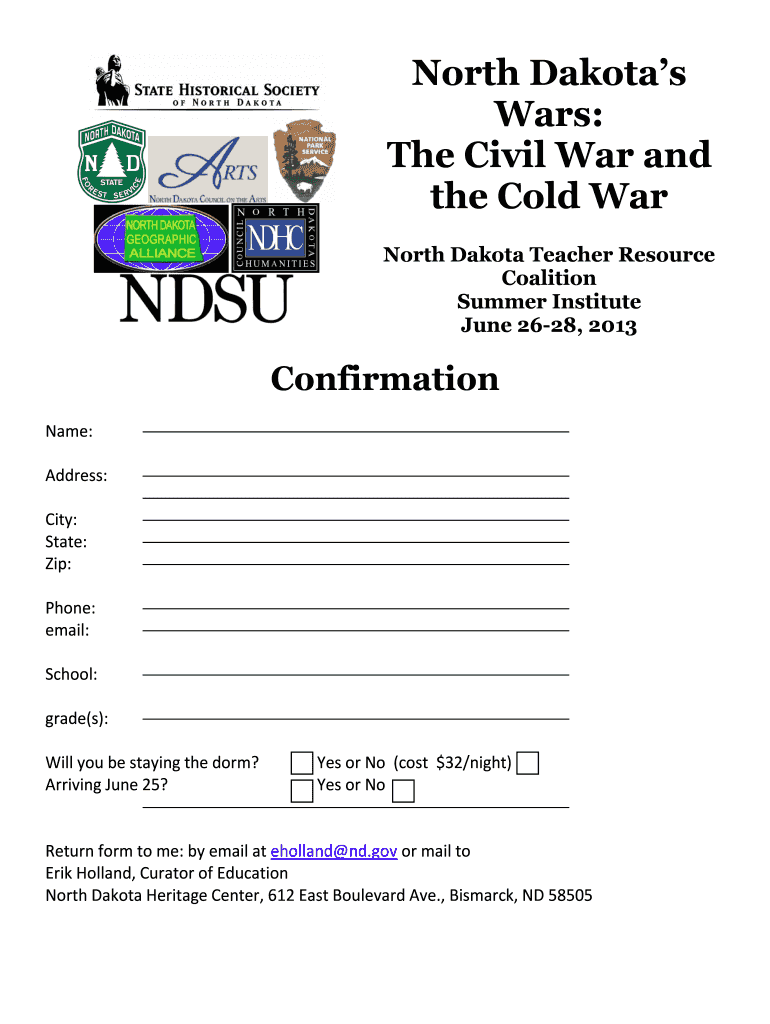 North Dakotas Wars: The Civil War and the Cold War North Dakota Teacher Resource Coalition Summer Institute June 2628, 2013 Confirmation Name: Address: City: State: Zip: Phone: email: School: grade’s):