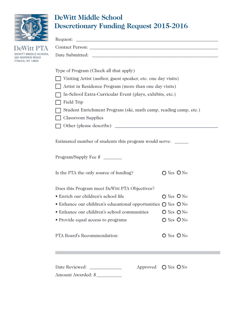 DeWitt PTA DEWITT MIDDLE SCHOOL. 560 WARREN ROAD ITHACA, NY 14850. DeWitt Middle School DE. s. creationary Funding Request 20152016. Request