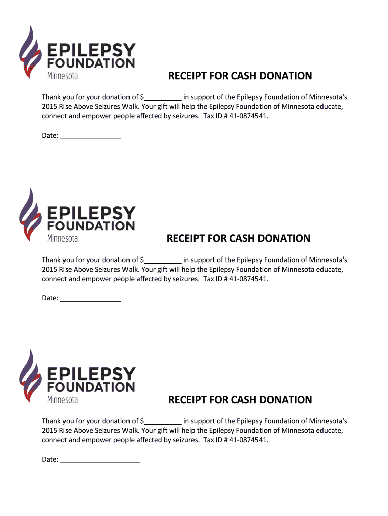 RECEIPT FOR CASH DONATION Thank you for your donation of $ in support of the Epilepsy Foundation of Minnesota's 2015 Rise Above Seizures Walk. Your gift will help the Epilepsy Foundation of Minnesota