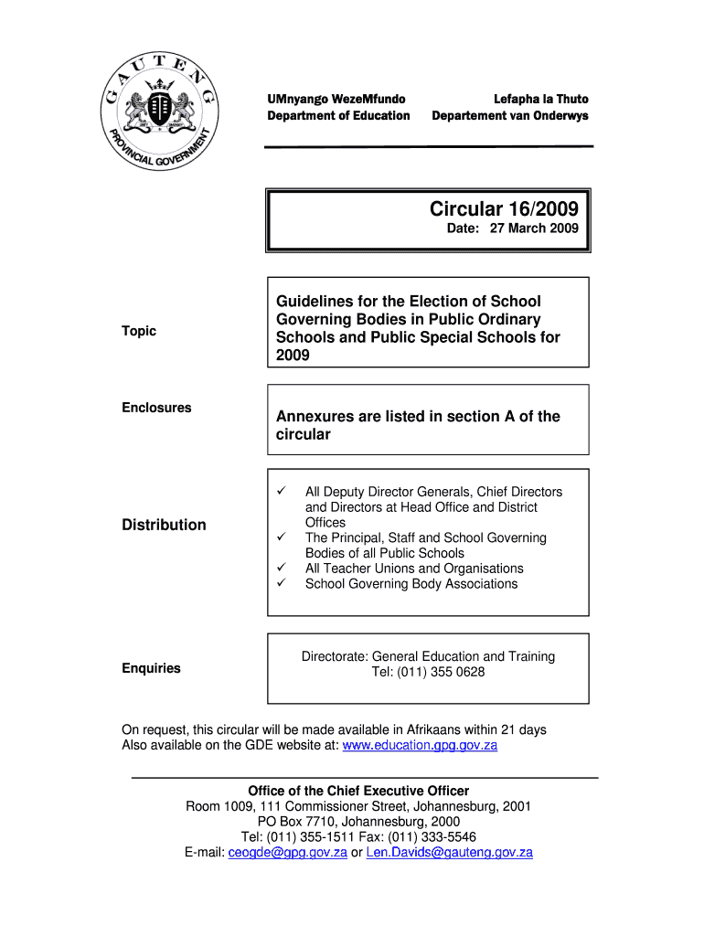 Mango Telemundo Department of Education Leap la Thu to Department van Orders Circular 16×2009 Date: 27 March 2009 Guidelines for the Election of School Governing Bodies in Public Ordinary Schools