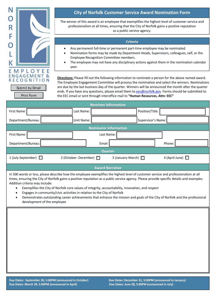 Directions:Pleasefillout YearsofServi CityofNorfolkCustomerService AwardNominationForm Thewinnerofthisawardisanemployeethatexemplifiesthehighestlevelofcustomerserviceand professionalismatalltimes,