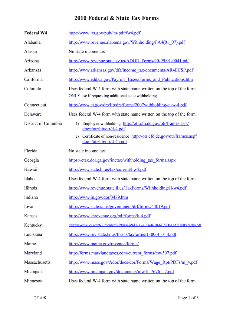 This document provides links to federal and state tax forms for the year 2010, including withholding forms for employees in various states and details regarding states without income tax.