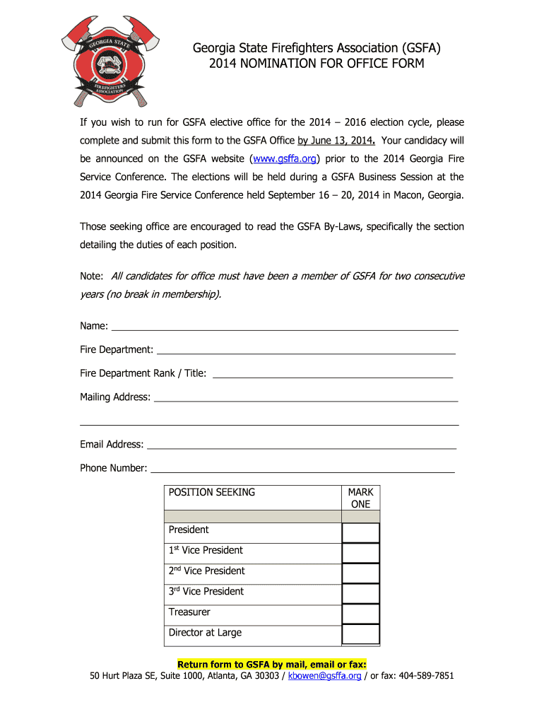 Georgia State Firefighters Association (GFA) 2014 NOMINATION FOR OFFICE FORM If you wish to run for GFA elective office for the 2014 2016 election cycle, please complete and submit this form to the