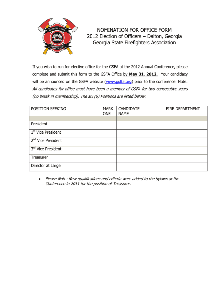 NOMINATION FOR OFFICE FORM 2012 Election of Officers Dalton, Georgia State Firefighters Association If you wish to run for elective office for the GFA at the 2012 Annual Conference, please complete