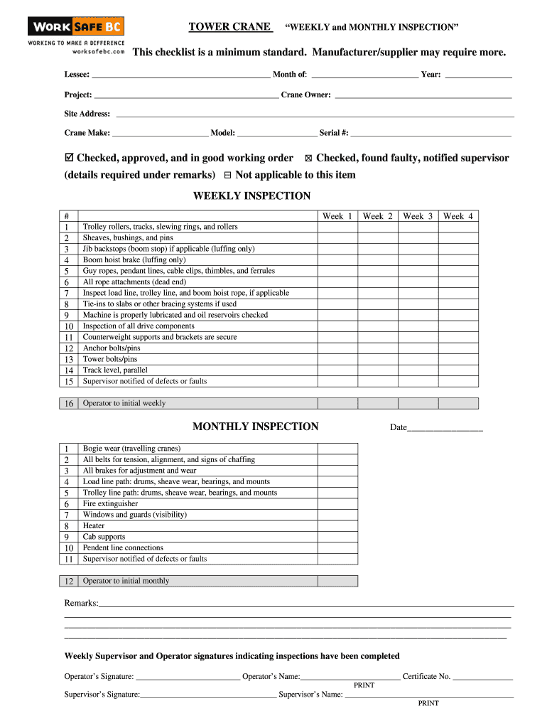 Get the free Tower Crane Weekly and Monthly Inspection Form