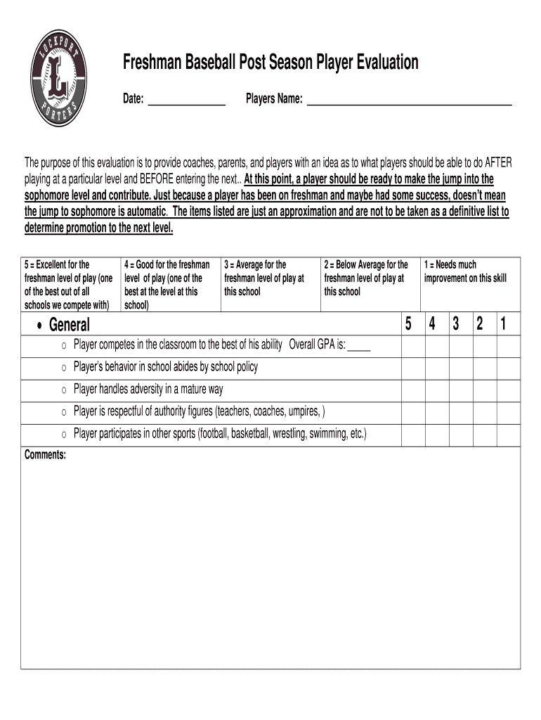 Get the free Freshman Baseball Post Season Player Evaluation - porterbaseball