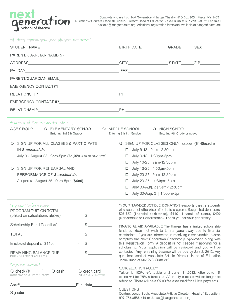 REG STATION D EAD LINE JUNE 15, 2012, Complete and mail to: Next Generation Hangar Theater PO Box 205 Ithaca, NY 14851 Questions? Contact Associate Artistic Director: Head of Education, Jesse Bush