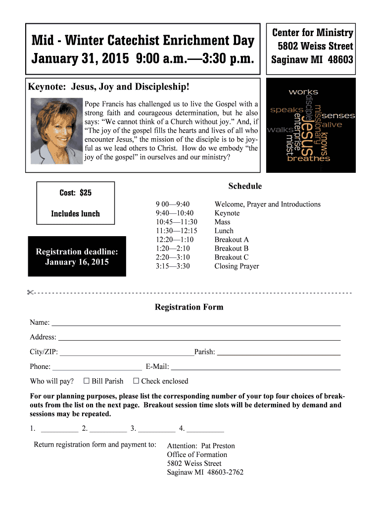 Mid-Winter Catechist Enrichment Day January 31, 2015 9:00 a.m.3:30 p.m. Center for Ministry 5802 Weiss Street Saginaw MI 48603 Keynote: Jesus, Joy and Discipleship! Pope Francis has challenged us