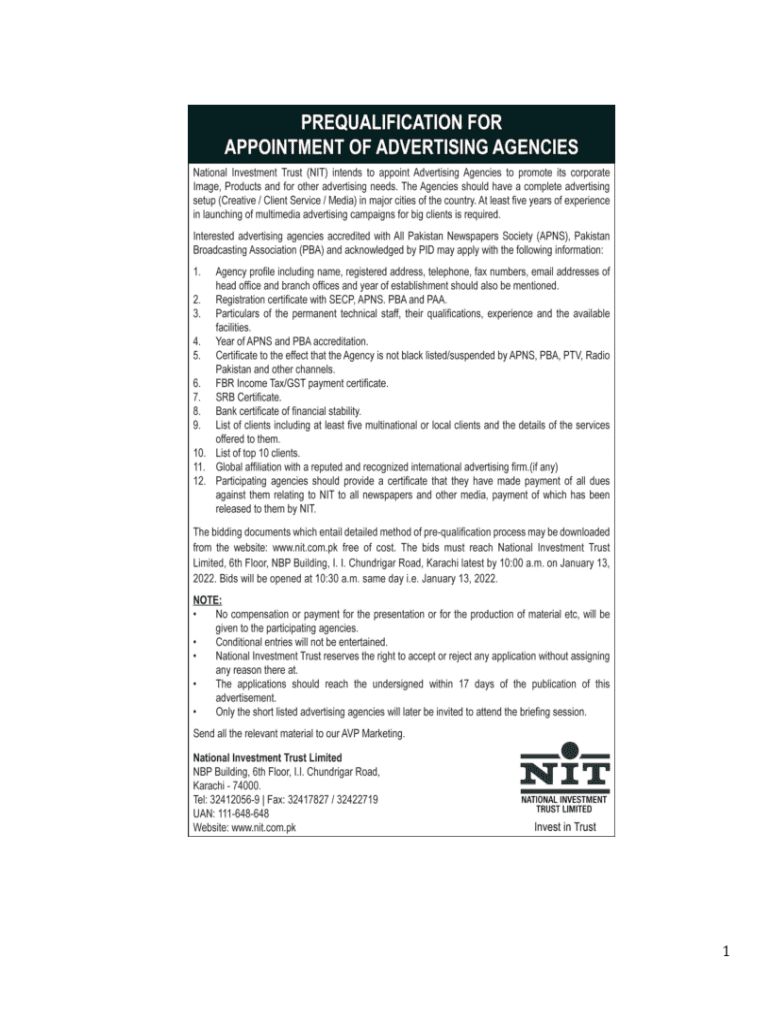 1NATIONAL INVESTMENT TRUST LIMITED MARKETING DEPARTMENTREQUEST FOR PROPOSAL (RFP)PREQUALIFICATION OF ADVERTISING AGENCIES FOR CREATIVE / CLIENT / MEDIA SERVICES TO NATIONAL INVESTMENT TRUST LIMITED,