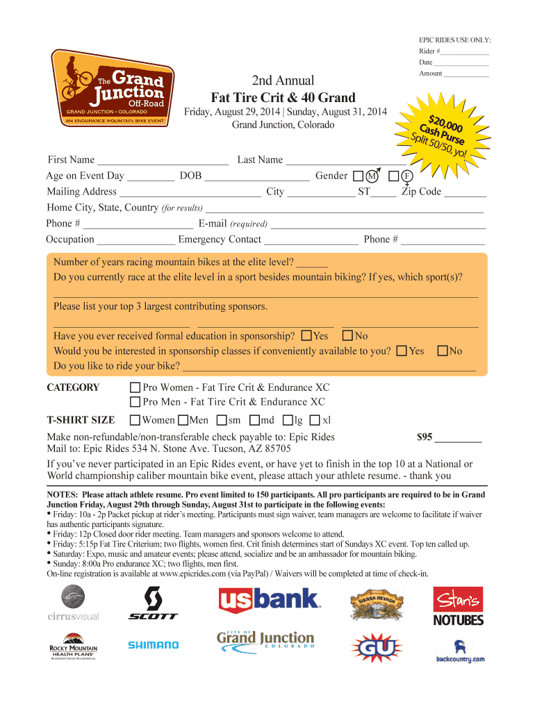 EPIC RIDES USE ONLY: Rider # Date 2nd Annual Fat Tire CRT & 40 Grand Friday, August 29, 2014, Sunday, August 31, 2014, Grand Junction, Colorado Amount $2 Cash0,000 Split Purse 50×5 0, yo ! First