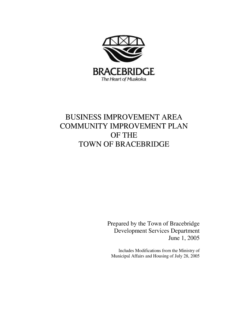 BUSINESS IMPROVEMENT AREA COMMUNITY IMPROVEMENT PLAN OF THE TOWN OF DRAWBRIDGE Prepared by the Town of Brace bridge Development Services Department June 1, 2005, Includes Modifications from the Ministry