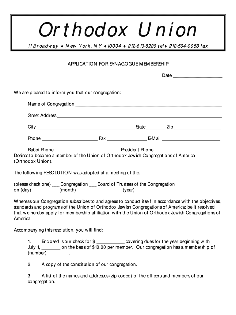 Orthodox Union 11 Broadway New York, NY 10004 2126138226 tel 2125649058 fax APPLICATION FOR SYNAGOGUE MEMBERSHIP Date We are pleased to inform you that our congregation: Name of Congregation Street