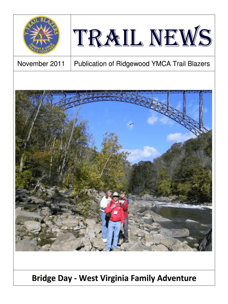 Trail News November 2011 Publication of Ridge wood YMCA Trail Blazers Bridge Day West Virginia Family Adventure Trail boss Letter Greetings Fellow Trailblazers, First, I need to send out a Thank you