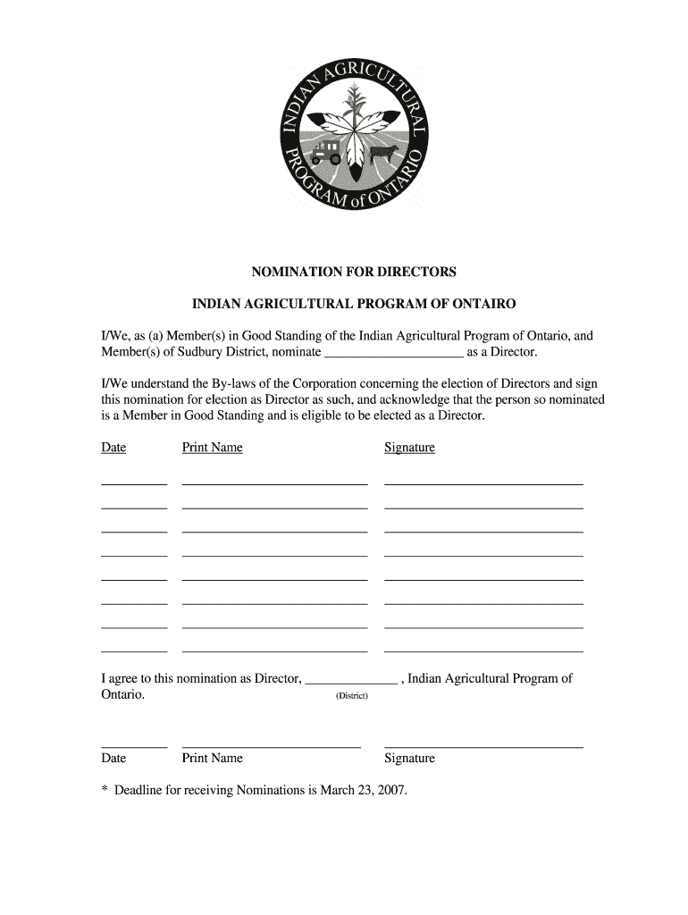 NOMINATION FOR DIRECTORS INDIAN AGRICULTURAL PROGRAM OF ONTARIO I×We, as (a) Member’s) in Good Standing of the Indian Agricultural Program of Ontario, and Member’s) of Sudbury District, nominate