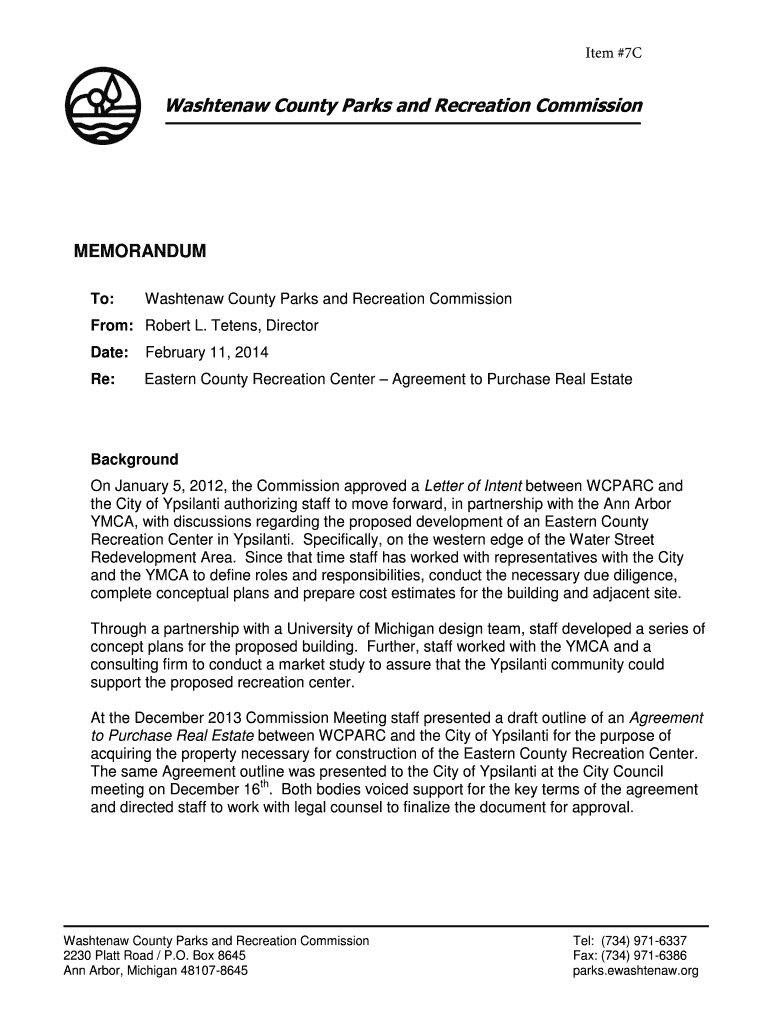 Item #7C Washtenaw County Parks and Recreation Commission MEMORANDUM To: Washtenaw County Parks and Recreation Commission From: Robert L. Teens, Director Date: February 11, 2014, Re: Eastern County