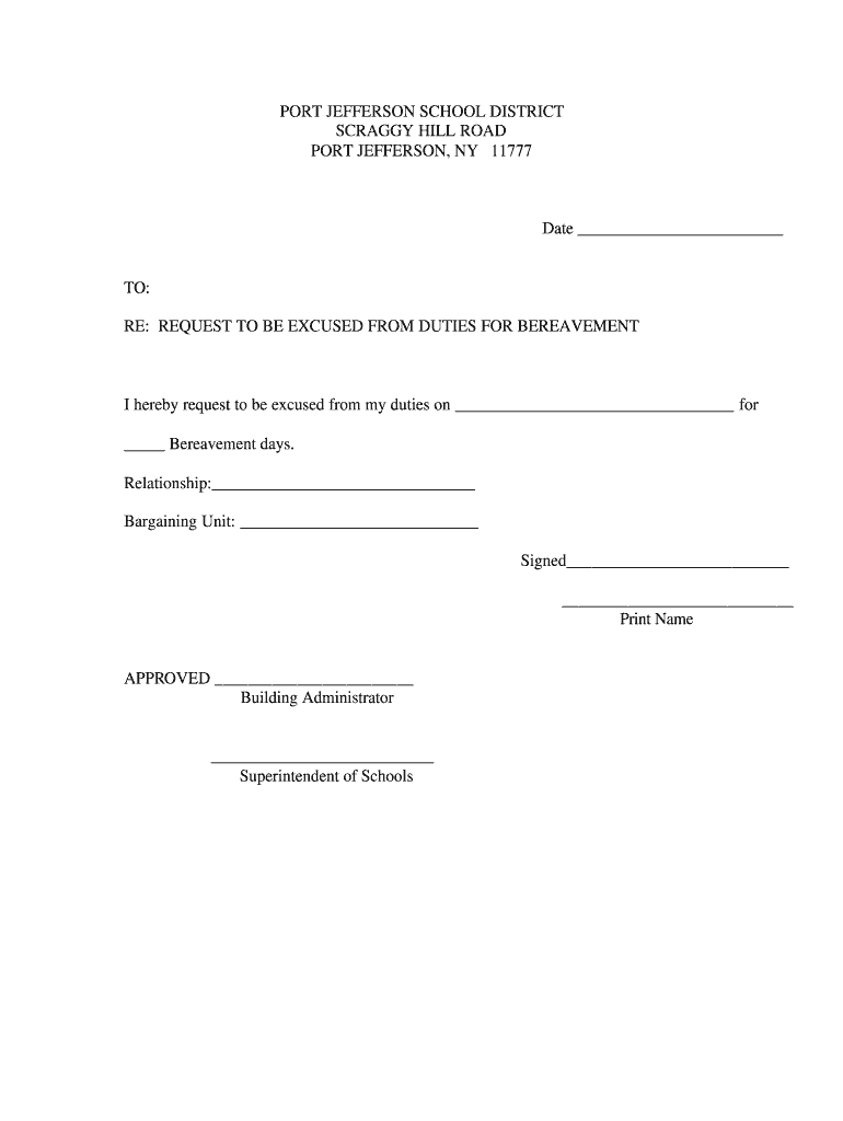 PORT JEFFERSON SCHOOL DISTRICT SCRAGGY HILL ROAD PORT JEFFERSON, NY 11777 Date TO: RE: REQUEST TO BE EXCUSED FROM DUTIES FOR BEREAVEMENT I hereby request to be excused from my duties on for Bereavement