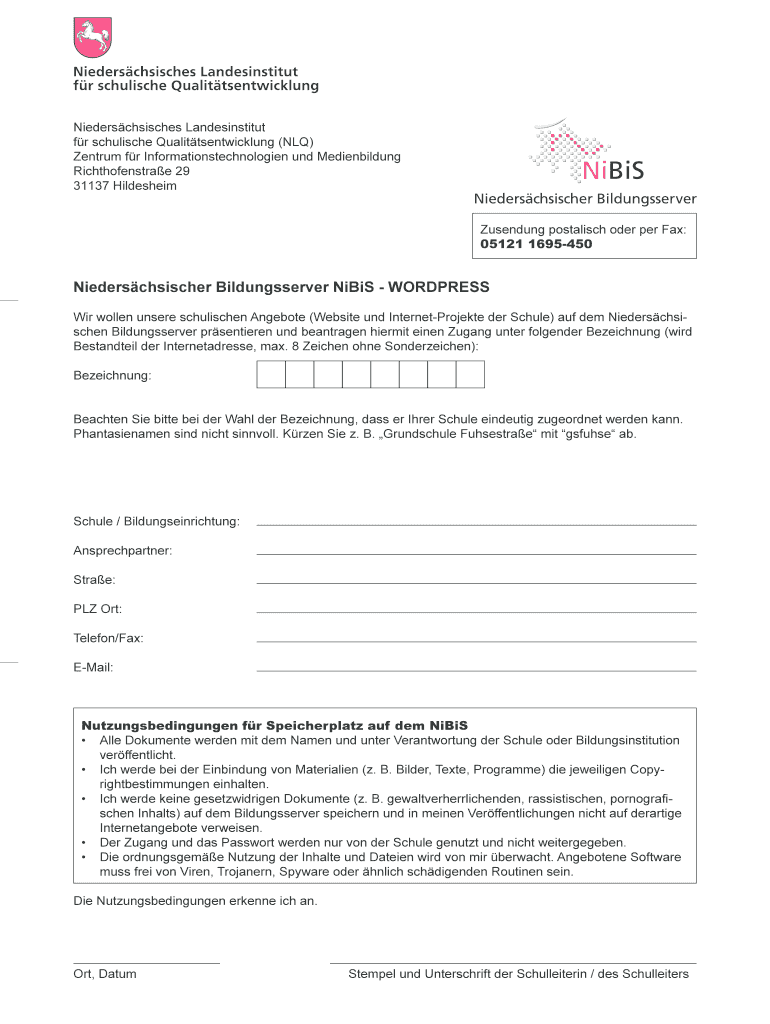 Niederschsisches Landesinstitut for schulische Qualittsentwicklung (NLS) Pentium for Informationstechnologien UND Medienbildung Richthofenstrae 29 31137 Hildesheim Sending postalize Oder per Fax: