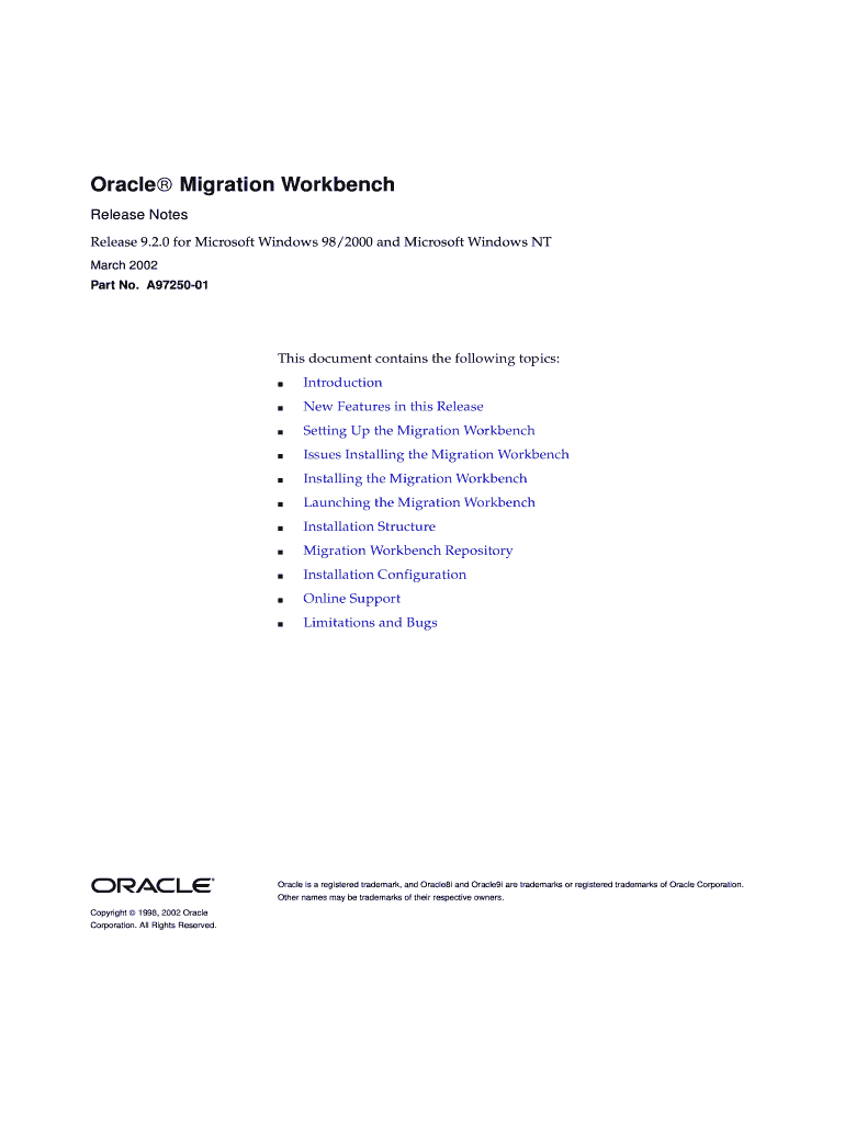 This document provides information on the installation, features, setup, and issues of the Oracle Migration Workbench version 9.2.0, detailing how to migrate various databases to Oracle.